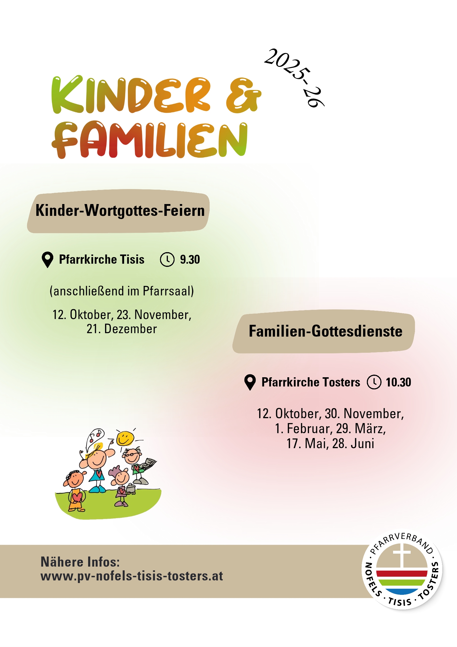 Für alle Kinder und Familien des Pfarrverbandes gibt es zwei verschiedene Formate, zu denen sie herzlich eingeladen sind: Kinder-Wort-Gottesdienste in der Pfarrkirche und im Pfarrsaal Tisis und Familiengottesdienste in der Pfarrkirche Tosters.